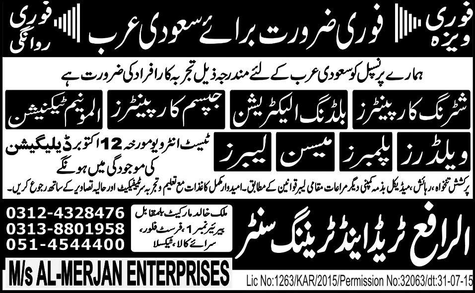 Shuttering Carpenters, Steel Fixers, Plumbers, Welders, Aluminum Technicians and Labors are required in Saudi Arabia.