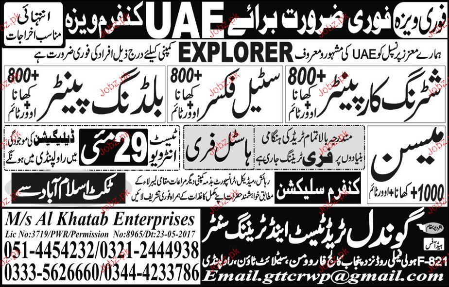 Shuttering Carpenters, Steel Fixers, Building Painters and Mason are required in UAE. Agency Gondal Trade Test and Training Center Rawalpindi. Test / Interview on 29 May.