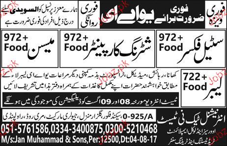 Shuttering Carpenters, Steel Fixers, Mason and Labors are required in UAE. Food, Medical and Residence will be provided by the Company. Qualified and Experienced Candidate Send their Cvs.