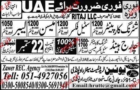 Shuttering Carpenters, Steel Fixers, Mason, charge Hand and Labors are required in UAE. Food, Medical and Residence will be provided by the Company. Test and Interview will be held on 22 Sep.