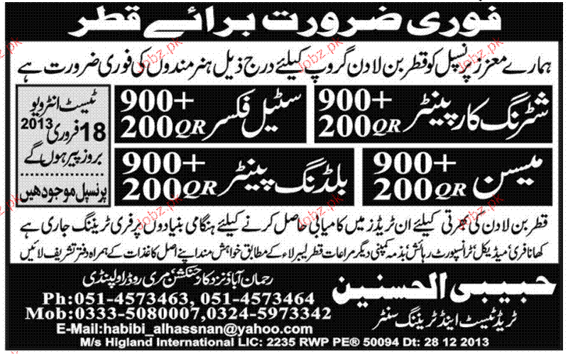 Shuttering Carpenters, Steel Fixers and Building Painters are required in Qatar