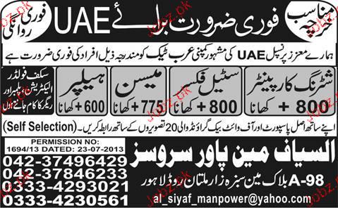 Shuttering Carpenters, Steel Fixers, Mason and helpers are required in UAE