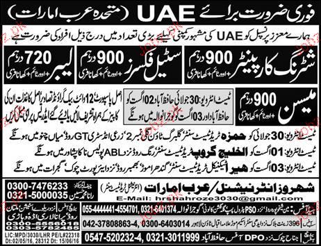 Shuttering Carpenters, Steel fixers, Labors Job Opportunity