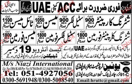 Shuttering Carpenters, Steel Fixers, Mason and Mason Foreman are required in UAE.