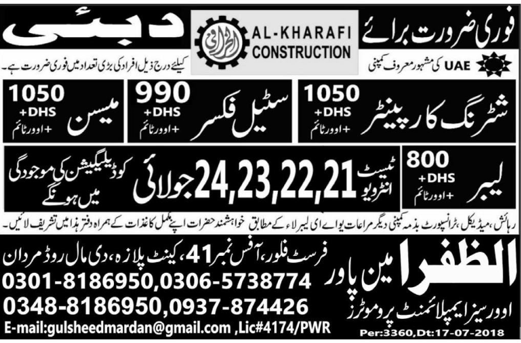 Latest Al Zafara Manpower Overseas Employment Promoters Construction Posts Dubai 2025