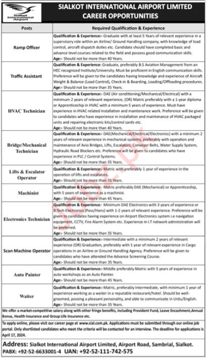 Sialkot International Airport Ltd Sialkot, sialkot Punjab Pakistan invites applications from eligible candidates for the post of traffic assistant, ramp officer, bridge technician, auto painter, machinist, waiter, mechanical technician, escalator operator, scan machine operator, hvac technician, lift operator and electronics technician as per advertisement of April 7, 2024 published in daily Jang Newspaper. Persons with Matric, Bachelor, Master and Intermediate etc. education can apply.