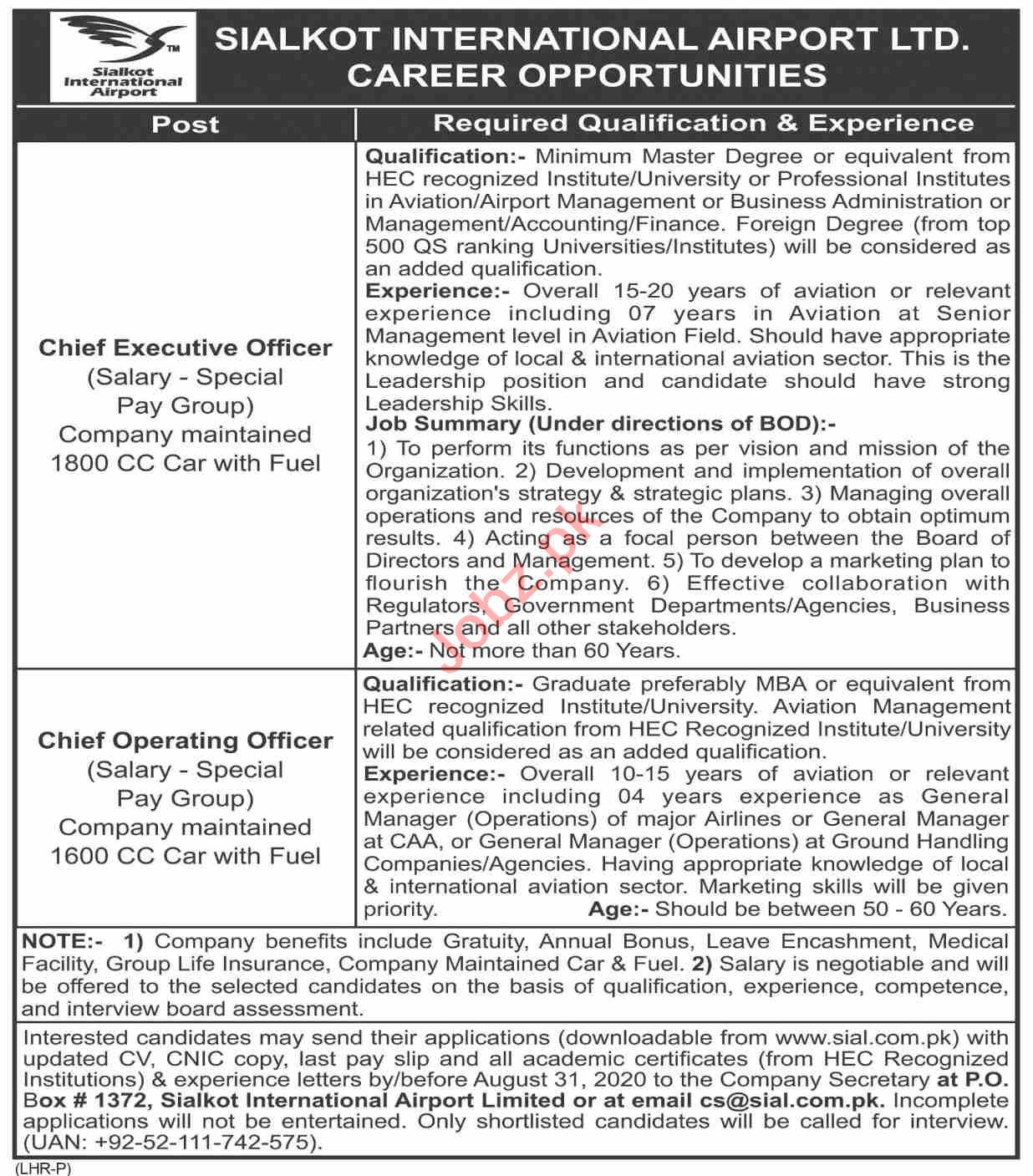 Sialkot International Airport Sial Jobs 2020 for CEO