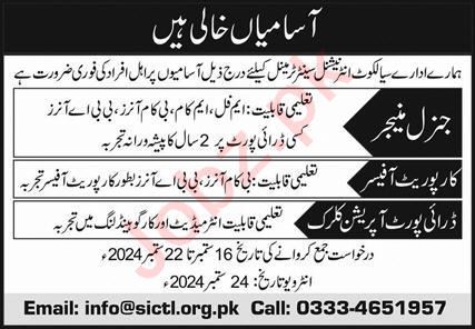 Sialkot International Center Terminal SICT Sialkot, sialkot Punjab Pakistan invites applications from eligible candidates for the post of corporate officer, dry port operation clerk and genera manager as per advertisement of September 16, 2024 published in daily Express Newspaper. Candidates with Bachelor, Master, B.com, Mphil, MS, Intermediate and BA etc. educational background will be preferred.