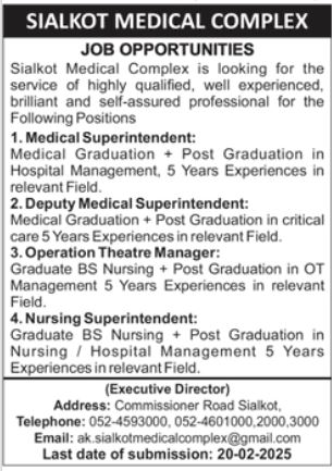 Vacant posts including deputy medical superintendent, medical superintendent, nursing superintendent and operation theatre manager are announced in Sialkot Medical Complex Sialkot, sialkot Punjab Pakistan as per 11 February 2025 advertisement in daily Jang Newspaper. Preferred Education is MS, Bachelor and Master etc.