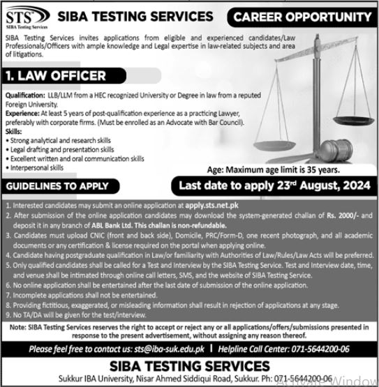 Vacant posts including law officer are announced in Siba Testing Service STS Sukkur, sukkur Sindh Pakistan as per 11 August 2024 advertisement in daily Jang Newspaper. LLb and LLM etc. educational qualification will be preferred.