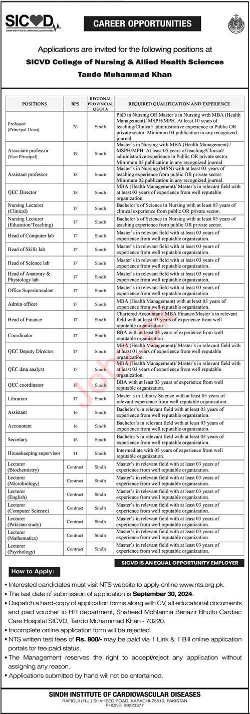 Apply at Sindh Institute of Cardiovascular Diseases latest Government jobs in Medical and departments before closing date which is around September 30, 2024 or as per closing date in newspaper ad. Read complete ad online via NTS to know how to apply on latest Sindh Institute of Cardiovascular Diseases job opportunities.