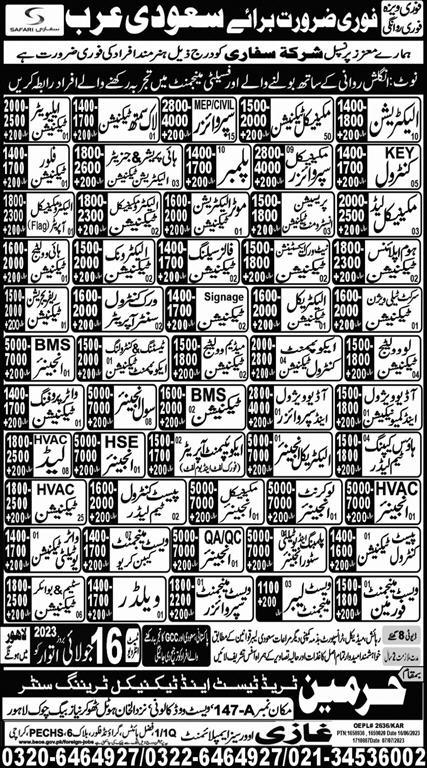 Harmain Trade Test & Technical Training Center Riyadh, dammam Saudi Arabia invites applications from eligible candidates for the post of chiller pump technician, boom lift operator, pest control team leader, generator electrician technician, hvac engineer, key controller, electrician, communication technician, qa engineer, water utility technician, hse engineer, work control center operator, civil engineer, bms technician, electrical engineer, mechanical technician, welder, electro mechanical operator, low current engineer, hvac technician, network extension technician, low current technician, electronics technician, fall ceiling technician, electrician lead man, waterproofing technician, electro mechanical technician, mep supervisor, elevator technician, testing control equipment technician, mechanical lead man, mechanical engineer, bms engineer, waste management foreman, qc engineer, plumber, house keeping team leader, proceen instrument technician, mechanical supervisor, communication supervisor, steam boiler technician, pest control technician, medium voltage technician, floor technician, av technician, fork lift operator, waste management labor, equipment control technician, waste management supervisor, waste management cabin crew, refrigeration technician, technician lock smith, hvac lead man, high voltage technician, motor winder and civil supervisor as per advertisement of July 11, 2023 published in daily Express Newspaper. Candidates with Intermediate, Bachelor, Matric, B.E and DAE etc. educational background will be preferred.