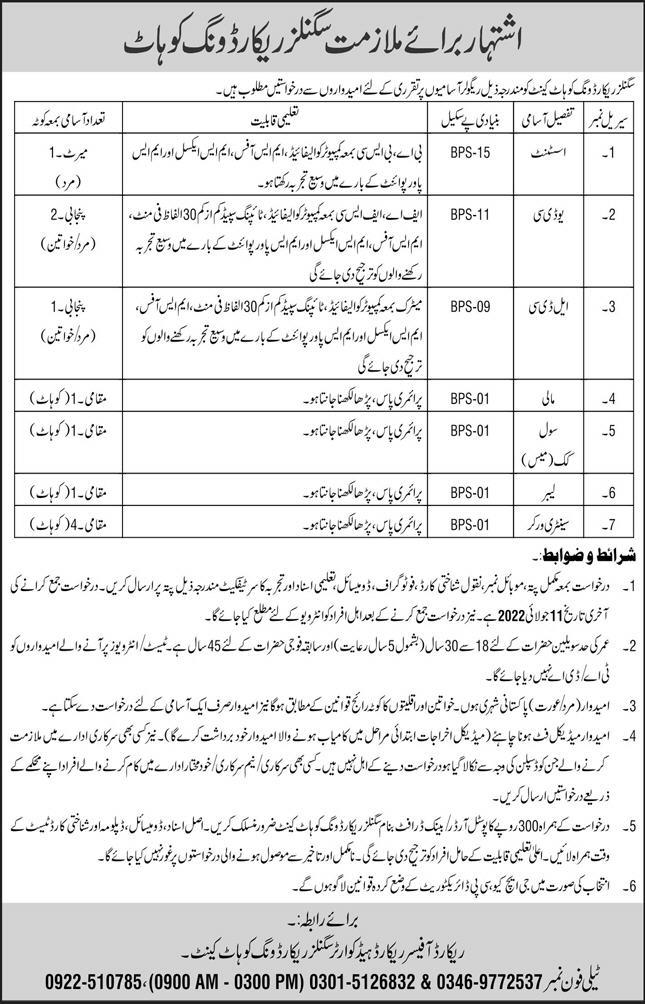 Vacancies in Signals Recording Kohat Advertisement June 2022
