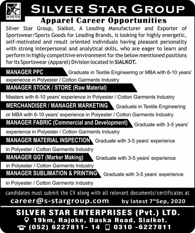 Silver Star Enterprises Pvt Limited requires the services of experienced and professional candidates for the positions of Manager PPC, Manager Stock, Manager Store Raw Material, Merchandiser, Manager Marketing, Manager Fabric Commercial, Manager Fabric Development, Manager Material Inspection, Manager GGT Marker Making, Manager Sublimation and Manager Printing in Sialkot.