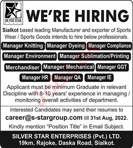 Vacant posts including manager knitting, manager qa, manager environment, manager dyeing, manager hr, merchandiser, manager compliance, manager ie, manager mechanical, manager submlimation, manager printing and manager ggt are announced in Silver Star Sialkot, sialkot Punjab Pakistan as per 14 August 2022 advertisement in daily Express Newspaper. Educational qualifications required Bachelor, Master, DAE, Matric and Intermediate etc.