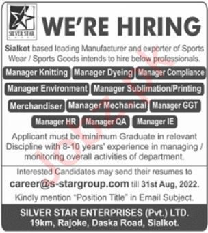 Silver Star invites applications for job positions advertised in daily Jang dated 14 August 2022 for following vacancies in Sialkot, sialkot Punjab Pakistan.