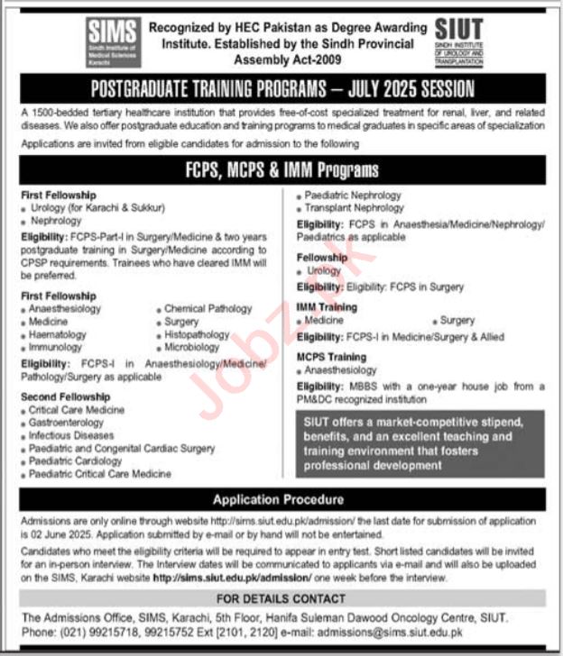 Sindh Institute of Medical Sciences jobs advertisement dated about 18 May 2025 in daily Jang Newspaper invites application for the vacant post of fcps fellowship programs, mcps fellowship program and imm fellowship program in Karachi, karachi Sindh Pakistan. P.G Diploma, MBBS and Others etc. educational qualification will be preferred.