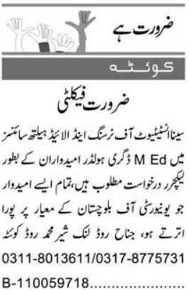 Sina Institute of Nursing jobs advertisement dated about 2 July 2025 in daily Express Newspaper invites application for the vacant post of lecturer and lecturer nursing in Muhammad Ali Jinnah Road Quetta, quetta Balochistan Pakistan. Bachelor and Master etc. educational qualification will be preferred.