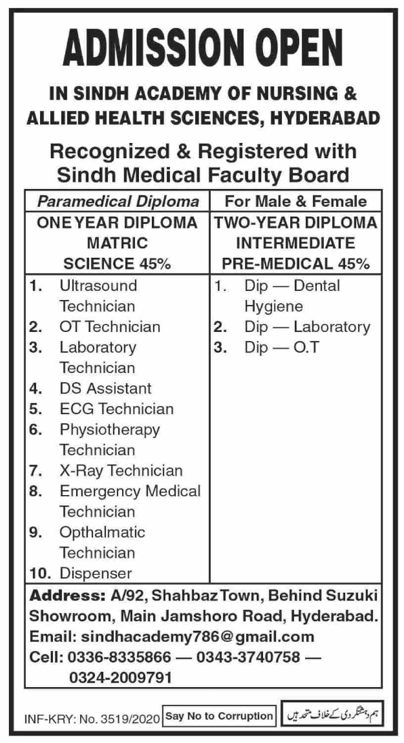 Sindh Academy of Nursing & Allied Health Sciences recognized & registered with Sindh Medical Faculty Board has announced admissions for paramedical diploma. Read newspaper ad for exact details.