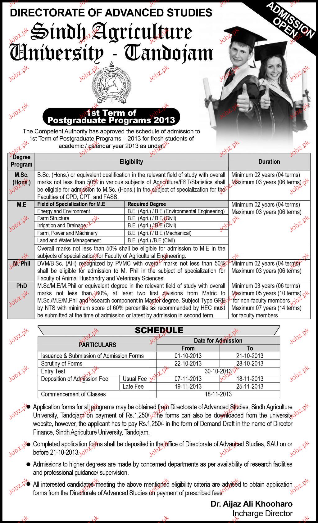 Sindh Agriculture University Tando Jam Admission in MSc, ME, Phill and Phd in tando Jam Read newspaper ad for exact details.