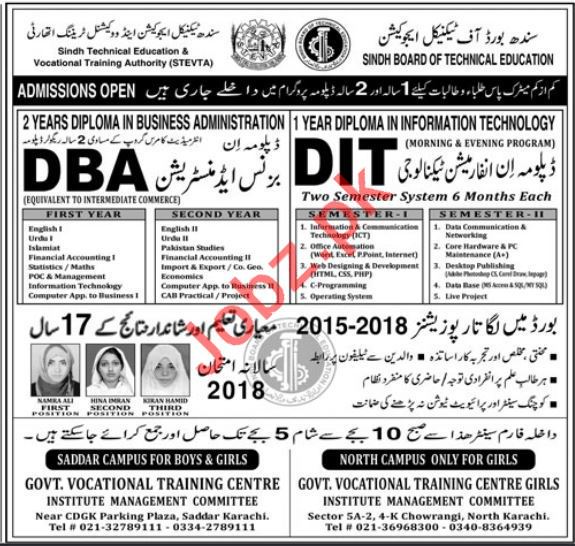 Sindh Board of Technical Education has announced the admissions in Diploma of Information Technology DIT, Diploma in Business Administration DBA in Sindh Technical and Vocational Training Authority STEVTA. Read newspaper ad for exact details.