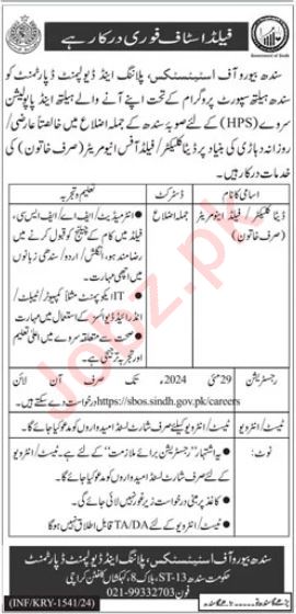 Sindh Bureau of Statistics SBS is looking for candidates for following posts as per job advertisement published in daily Jang Newspaper of May 19, 2024 for location Karachi, karachi Sindh Pakistan: