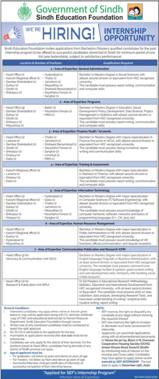 Vacancies in Sindh Education Foundation SEF Advertisement December 2020
