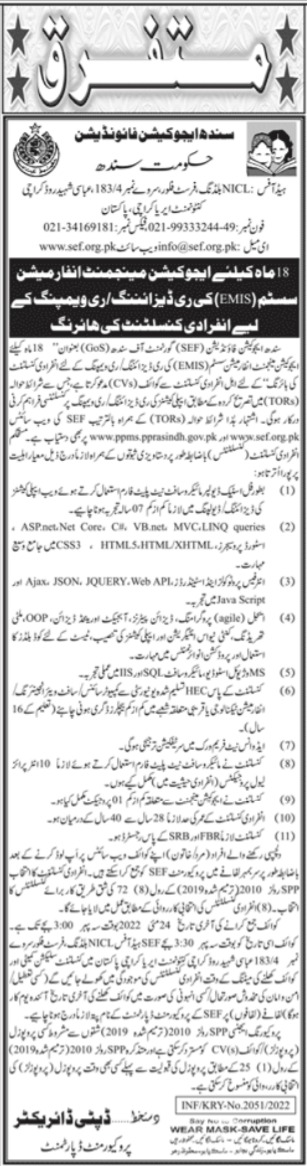 Sindh Education Foundation is looking for candidates for following posts as per job advertisement published in daily Jang Newspaper of April 24, 2022 for location Karachi, karachi Sindh Pakistan: