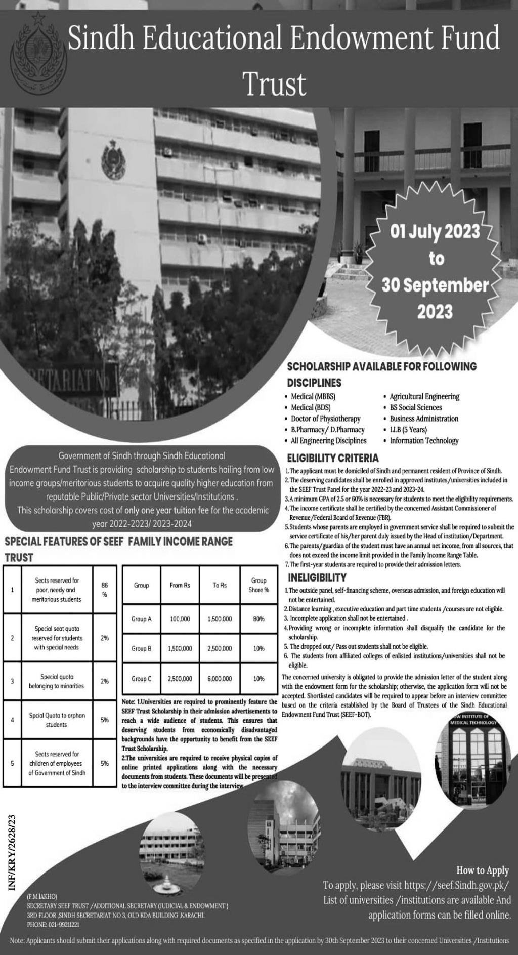 Sindh Educational Endowment Fund admissions 2023 for SEEF Scholarship Program for low Income Family Students of MBBS, BDS, DPT, B Pharmacy, D Pharmacy, All Engineering Disciplines, Agricultural Engineering, BS Social Science, Business Administration, LLB 5 Years, Information Technology has been announced. Eligible students who qualify as per admission criteria in Sindh Educational Endowment Fund Karachi Sindh Pakistan can apply in Other University for academic year 2023. Students for admissions in BS, Pharm D, LLb, MBA, DPT, BDS, B Pharmacy, BBA and MBBS & criteria can apply as per Government institute admission policy 2023 before closing date September 30, 2023 as per advertisement. Read newspaper ad for exact details.