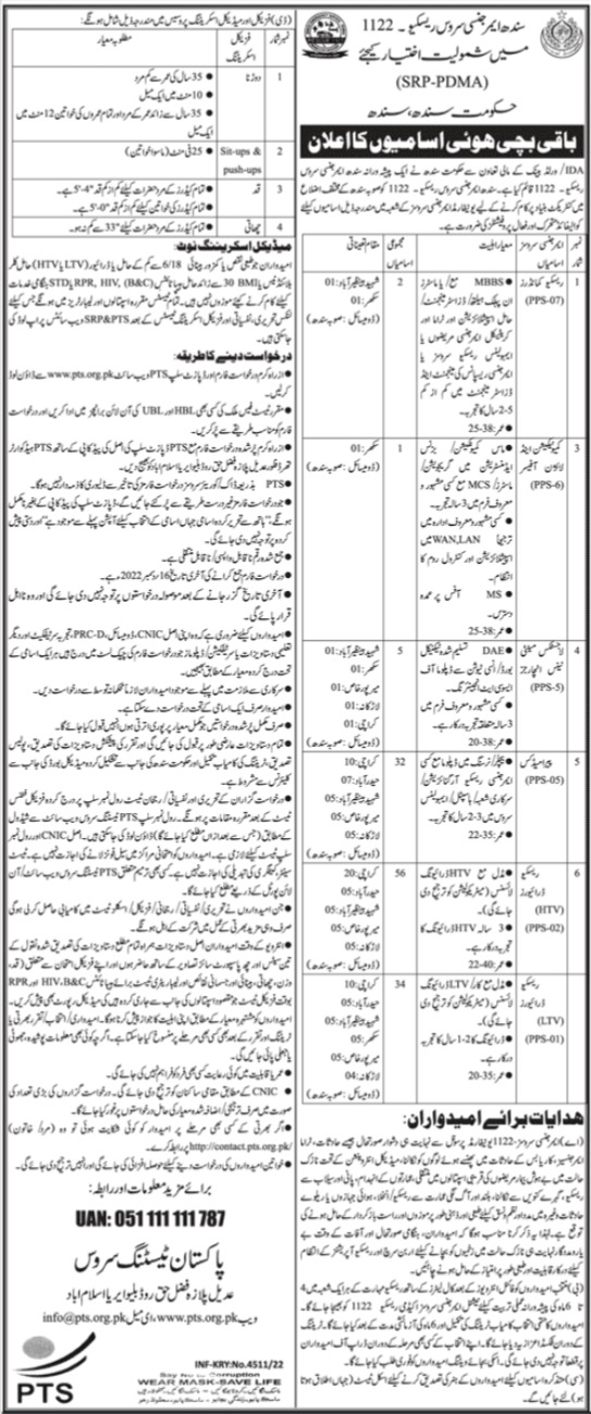 Sindh Emergency Service Rescue 1122 Jobs 2022 via PTS