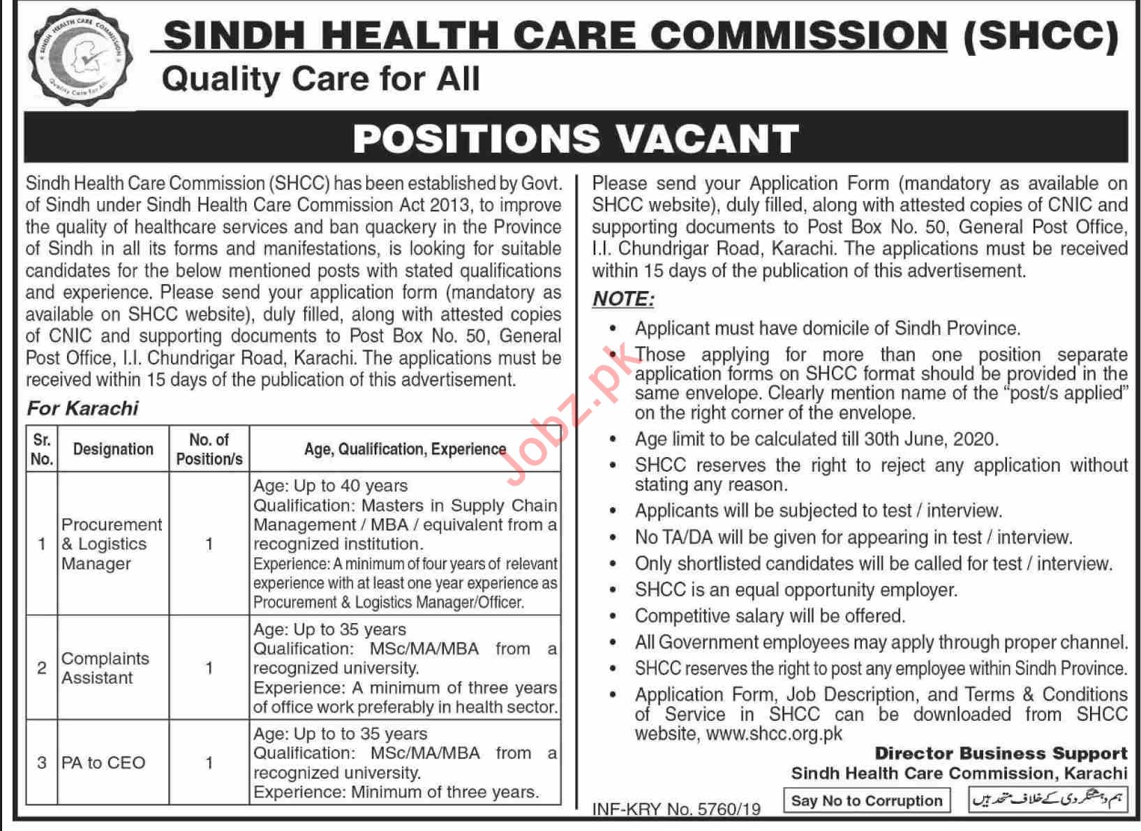 Sindh Health Care Commission SHCC Karachi, Government of the Sindh are inviting applications from experienced and motivated individuals to fill the positions of Manager Procurement, Manager Logistics, Complaints Assistant, PA, Personal Assistant, Secretary.