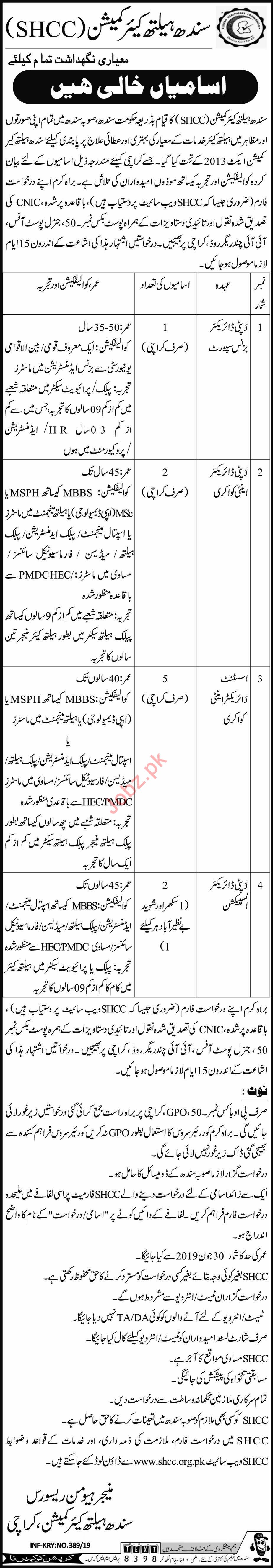 Vacancies in Sindh Healthcare Commission SHCC Advertisement January 2019