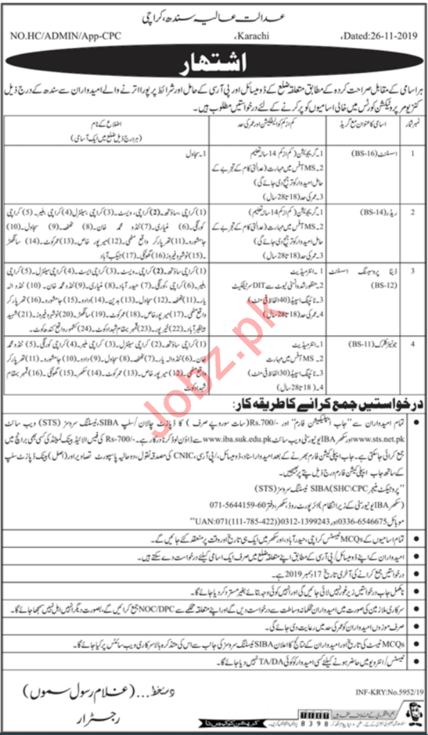 Sindh High Court invites applications from qualified and experienced individuals for the posts of Assistant, Reader, Data Processing Assistant and Junior Clerk in Karachi, Mirpurkhas, Umerkot, Sanghar, Naushahro Feroze, Ghotki, Jacobabad, Khairpur, Thatta, Hyderabad, Shujwal, Badin, Jamshoro, Dadu, Tharparkar, Sukkur via SIBA Testing Services STS 2019.