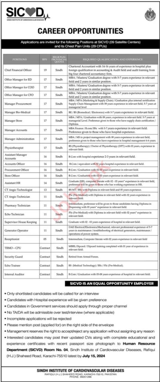 Vacant posts including trmo, echo trainee, chief financial officer, pharmacy technician, office manager for cfo, manager store, internal auditor, manager bio medical, supervisor house keeping, office manager for ed, generator operator, office manager for coo, procurement officer, security guard, manager procurement, receptionist, ct angio technician, assistant hr, manager administration, manager accounts, echo technician, physiotherapist, store officer, ct angio technologist, accounts officer and assistant manager accounts are announced in Sindh Institute of Cardiovascular Diseases Karachi, karachi Sindh Pakistan as per 1 July 2024 advertisement in daily Jang Newspaper. Candidates with Bachelor, MBA, MS, Master and B.com etc. educational background will be preferred.