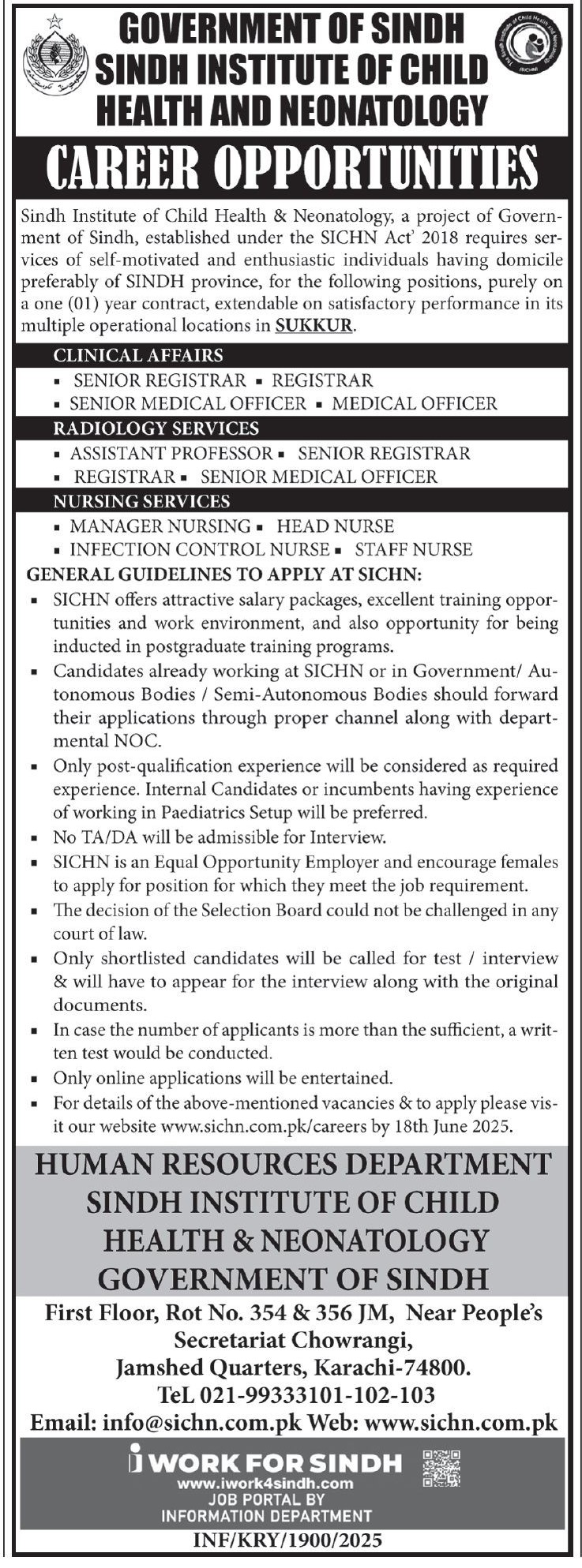 Sindh Institute of Child Health & Neonatology SICHN invites applications for job positions advertised in daily Express Tribune dated 5 June 2025 for following vacancies in Jamshed Quarters Karachi, sukkur Sindh Pakistan.