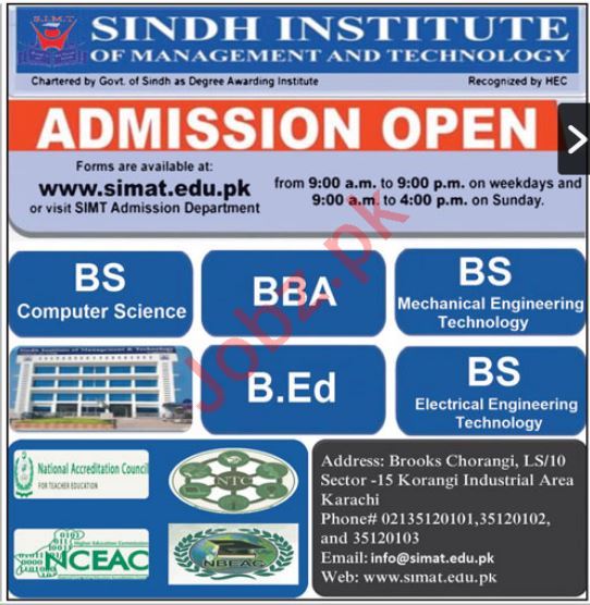 Sindh Institute of Management & Technology is offering admissions in BS Computer Science, BBA, BS Mechanical Engineering Technology, BS Electrical Technology, B.Ed in Karachi. Read newspaper ad for exact details.