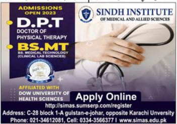 Sindh Institute of Medical Sciences has announced admissions 2022 for DPT Doctor of Physical Therapy, BS Medical Technology BSMT, BS Medical Lab Technology, Clinical Lab Technology. Eligible students who qualify as per admission criteria in Sindh Institute of Medical Sciences Karachi Sindh Pakistan can apply in Medical University for academic year 2022. Eligible candidates for admissions in BS and DPT can apply as per Private institute criteria and before closing date 16 November 2022 after reading advertisement online. Read newspaper ad for exact details.