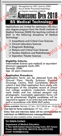 Sindh Institute of Medical Sciences Admission in BS Medical Technology in Karachi. Admission Forms can be Obtained from the ground Floor Hanifa Suleman Dawood Oncology Center in Karachi. Read newspaper ad for exact details.