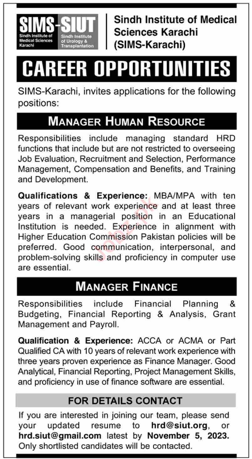Sindh Institute of Medical Sciences jobs advertisement dated about 29 October 2023 in daily Dawn Newspaper invites application for the vacant post of manager human resource and manager finance in Karachi, karachi Sindh Pakistan. Educational qualifications required Bachelor, Master, MBA and ACCA etc.