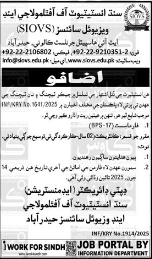 Apply at Sindh Institute of Ophthalmology & Visual Sciences SIOVS latest Government jobs in Medical and departments before closing date which is around June 14, 2025 or as per closing date in newspaper ad. Read complete ad online to know how to apply on latest Sindh Institute of Ophthalmology & Visual Sciences SIOVS job opportunities.