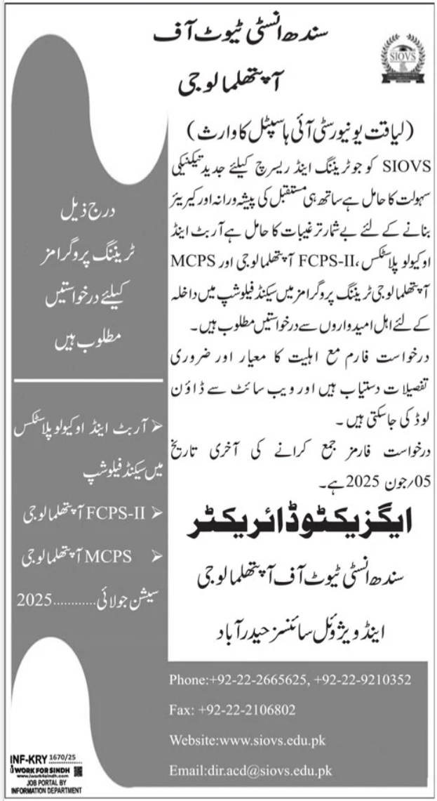 Sindh Institute of Ophthalmology & Visual Sciences SIOVS latest Government Medical jobs and others can be applied till 5 June 2025 or as per closing date in newspaper ad. Read complete ad online to know how to apply on latest Sindh Institute of Ophthalmology & Visual Sciences SIOVS job opportunities.