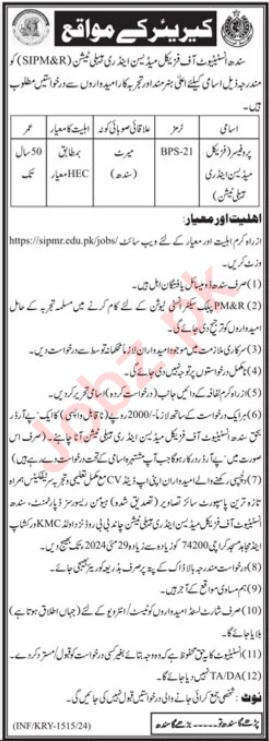 Sindh Institute of Physical Medicine & Rehabilitation jobs advertisement dated about 19 May 2024 in daily Jang Newspaper invites application for the vacant post of professor physical medicine rehabilitation and professor in Karachi, karachi Sindh Pakistan. Educational qualifications required Master, Mphil and Phd etc.