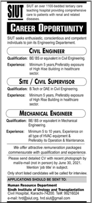 Vacancies in Sindh Institute of Urology and Transplantation SIUT Advertisement June 2021