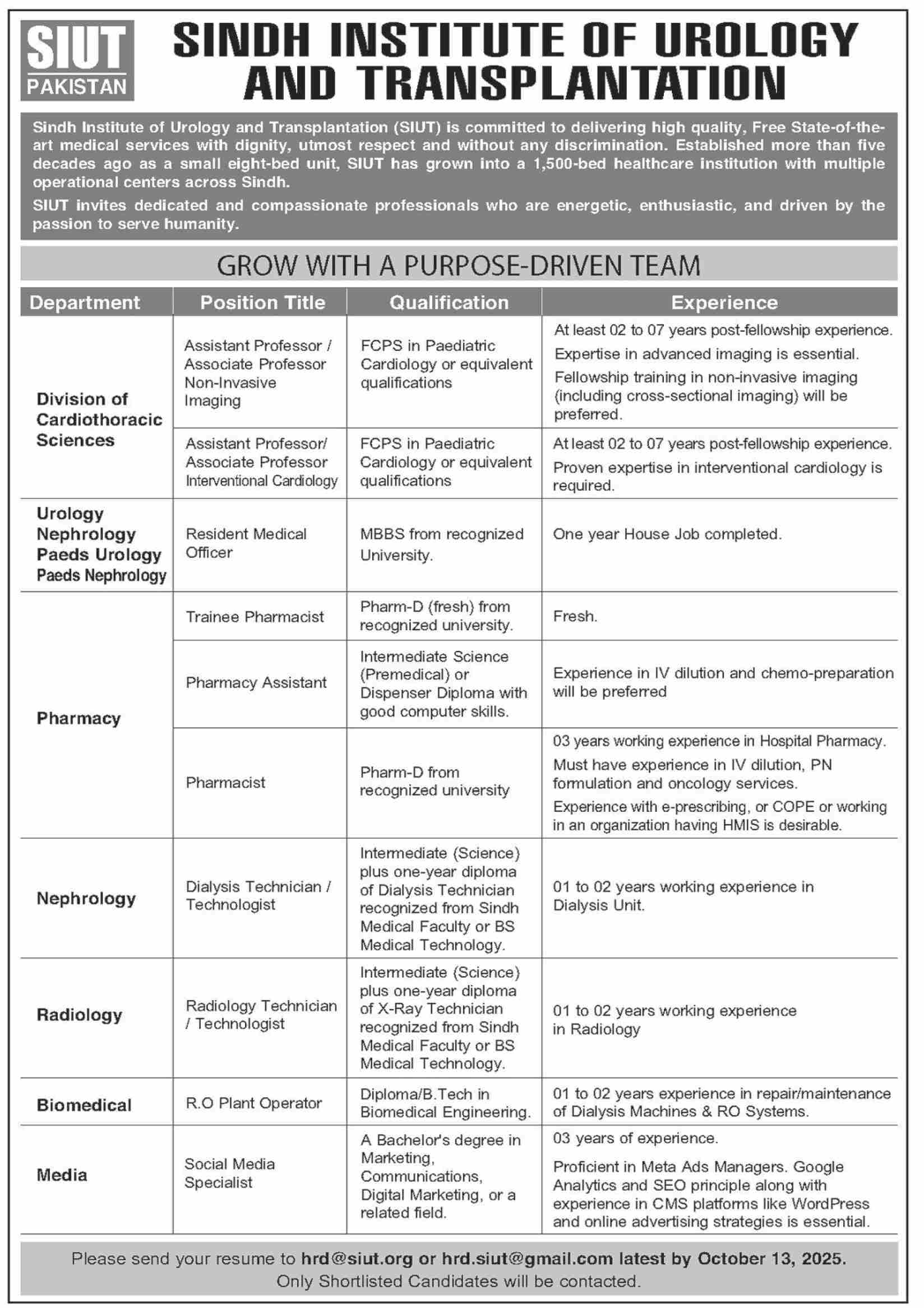 Sindh Institute of Urology and Transplantation SIUT Karachi, karachi Sindh Pakistan invites applications from eligible candidates for the post of Ro Plant Operator, Pharmacy Assistant, Trainee Pharmacist, Dialysis Technician, Associate Professor, Assistant Professor, Pharmacist, Radiology Technician, Resident Medical Officer and Social Media Specialist as per advertisement of September 29, 2025 published in daily Dawn Newspaper. Preferred Education is Phd, Bachelor, Mphil and Master etc.