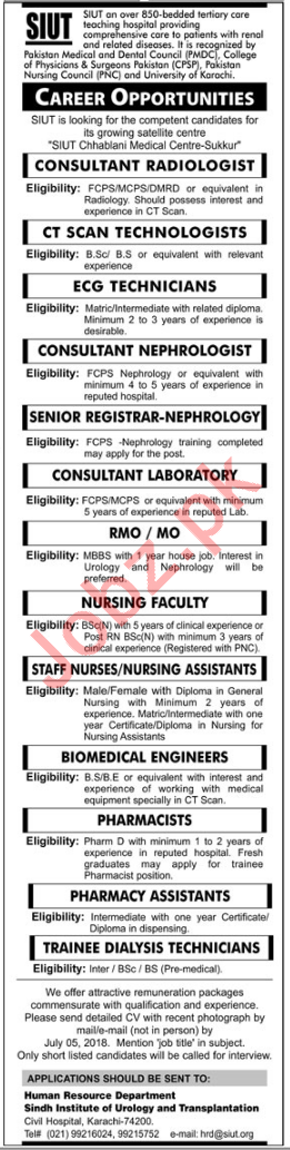 Sindh Institute Of Urology & Transplantation SIUT Jobs 2018