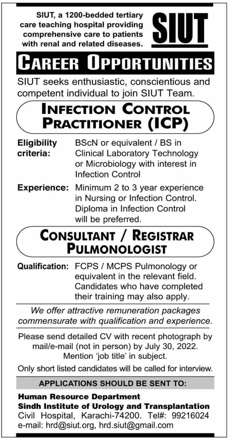 Sindh Institute of Urology and Transplantation SIUT jobs advertisement dated about 17 July 2022 in daily Dawn Newspaper invites application for the vacant post of medical consultant, registrar, infection control practitioner and pulmonologist in Karachi, karachi Sindh Pakistan. Persons with MBBS and Others etc. education can apply.