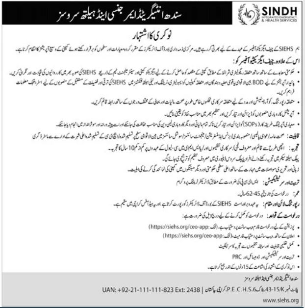 Sindh Integrated Emergency & Health Services jobs advertisement dated about 12 June 2022 in daily Jang Newspaper invites application for the vacant post of chief executive officer ceo in Karachi, karachi Sindh Pakistan. Persons with Bachelor and Master etc. education can apply.