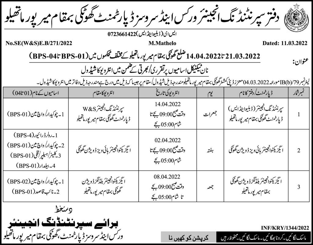 Engineer Works and Services Department Ghotki, ghotki and mirpur mathelo Sindh Pakistan invites applications from eligible candidates for the post of roller driver, coolie, helper, chowkidar, watchman, beldar, naib qasid and cleaner as per advertisement of March 15, 2022 published in daily Express Newspaper. Educational qualifications required Primary and Middle etc.