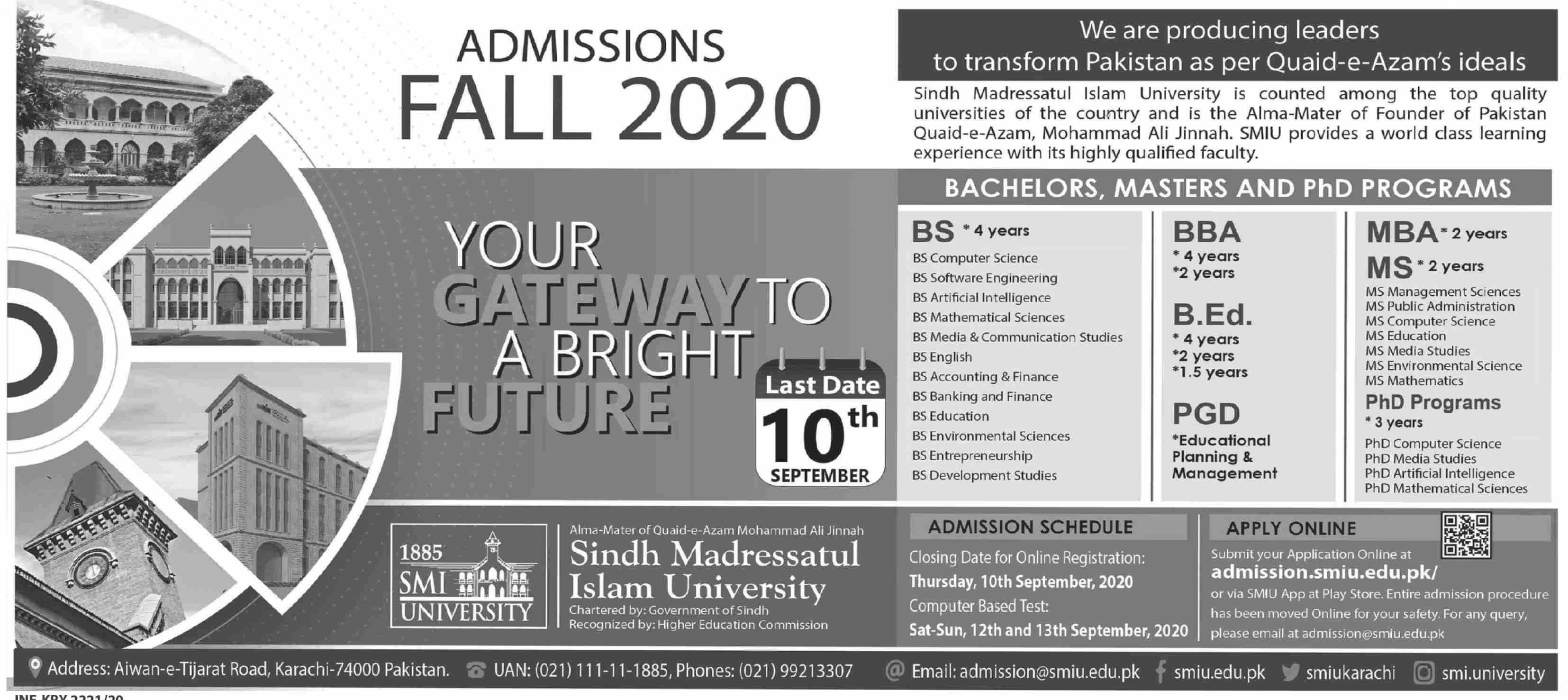 Sindh Madressatul Islam University invited applications for admissions in Bachelors, BS, BBA, B.Ed, Post Graduate Diploma, Masters, MBA, MS and PhD Programs in Karachi. Read newspaper ad for exact details.