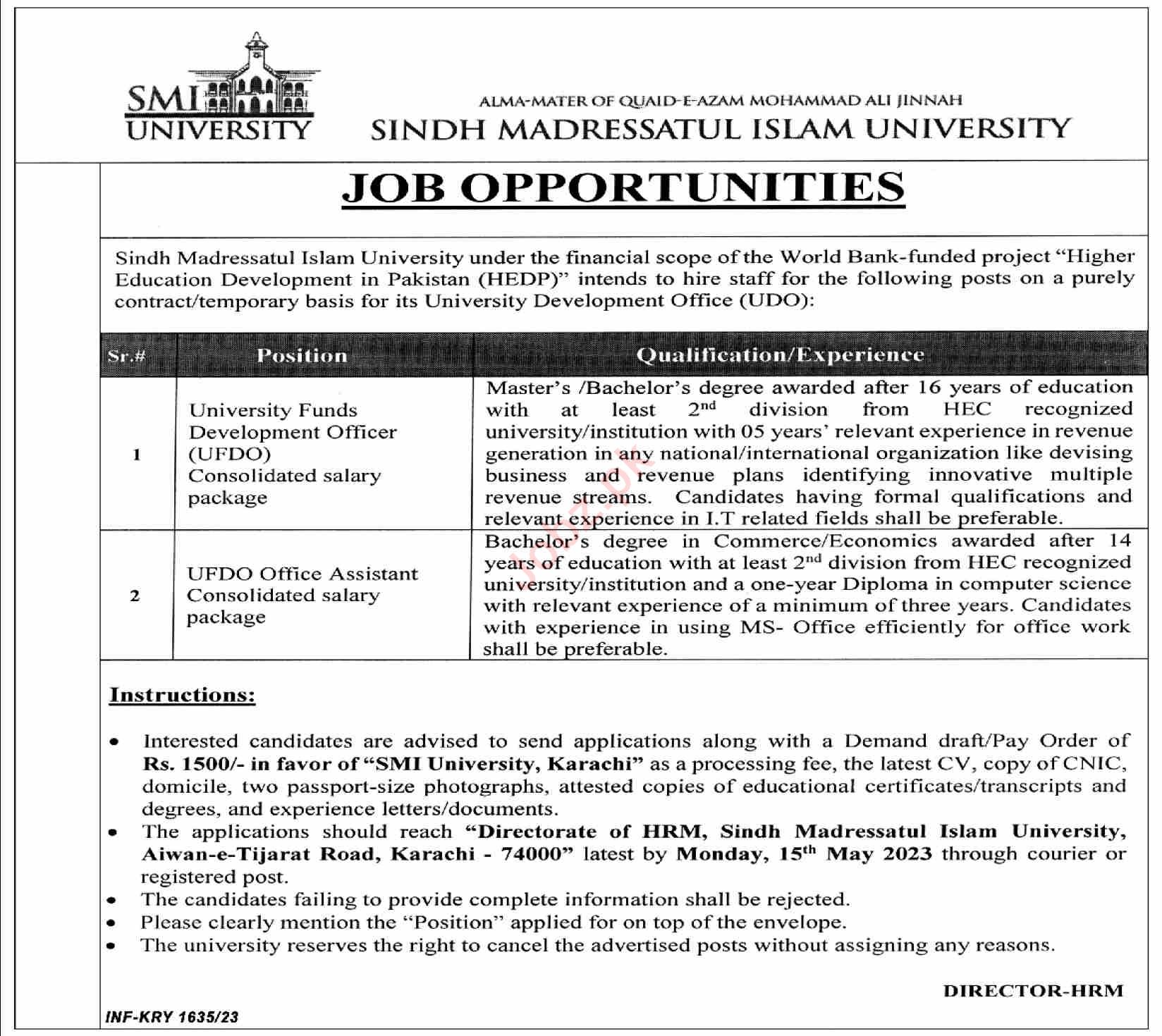 Sindh Madressatul Islam University Karachi, karachi Sindh Pakistan invites applications from eligible candidates for the post of ufdo office assistant and university funds development officer ufdo as per advertisement of May 1, 2023 published in daily Dawn Newspaper. Bachelor, Master and MS etc. educational qualification will be preferred.
